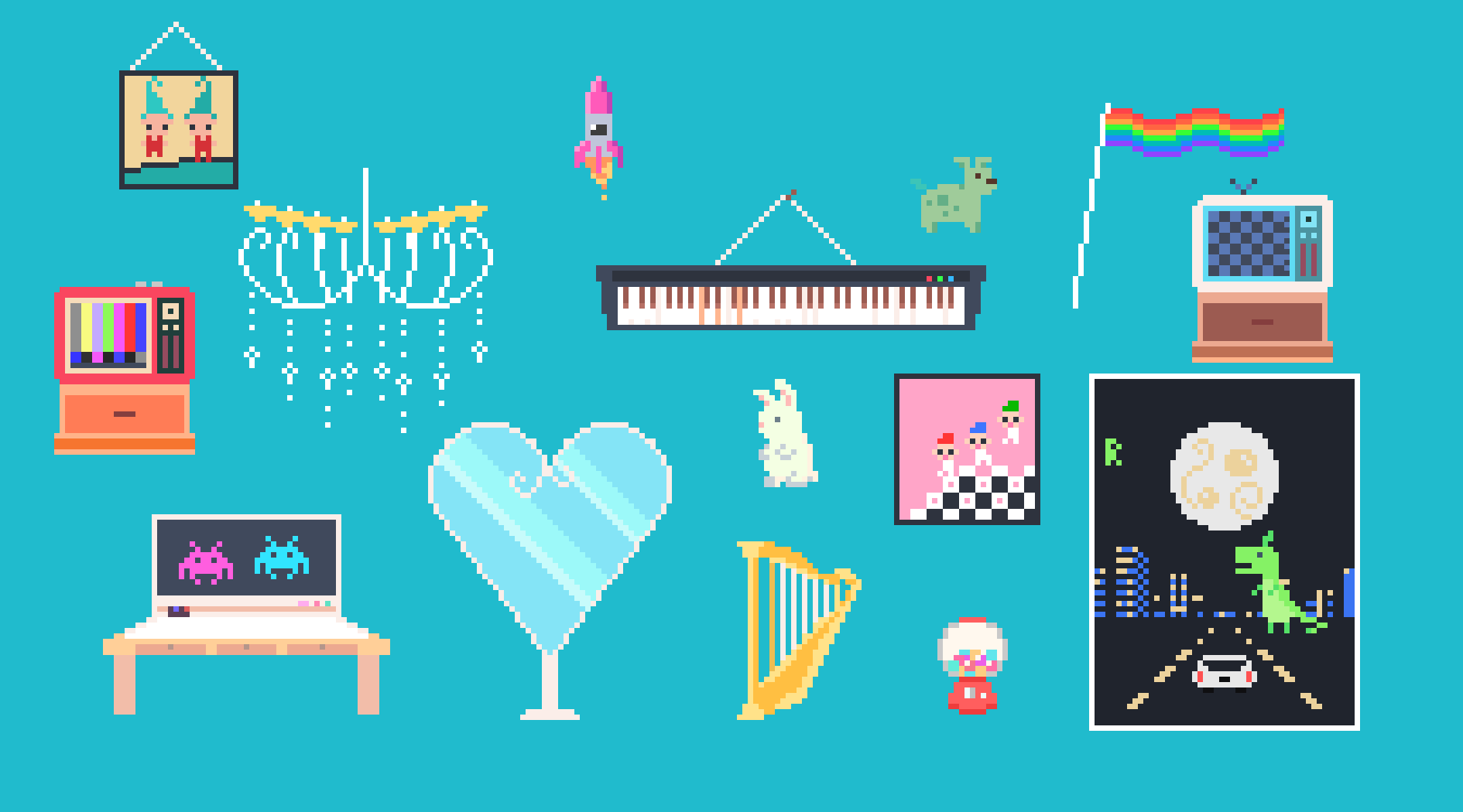 Various animations made in Spine2D, Piskel, Blender, Procreate, and Photoshop.