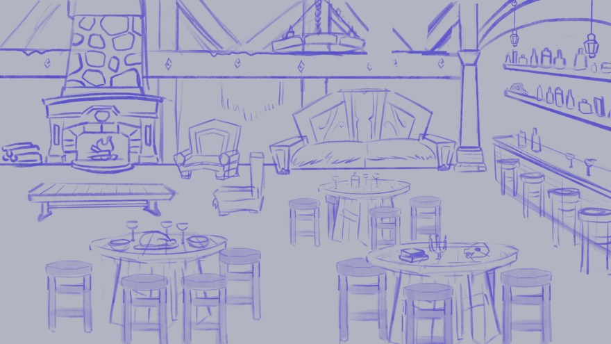 Created for Blizzard via Double A Labs: an illustration for a virtual meeting space! I photo bashed elements from existing images, including the fireplace and the bar. This process involved skewing, color correcting, and painting over parts to blend them into the overall illustration.