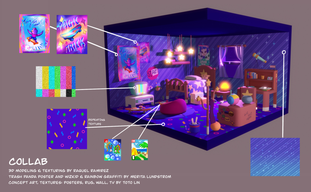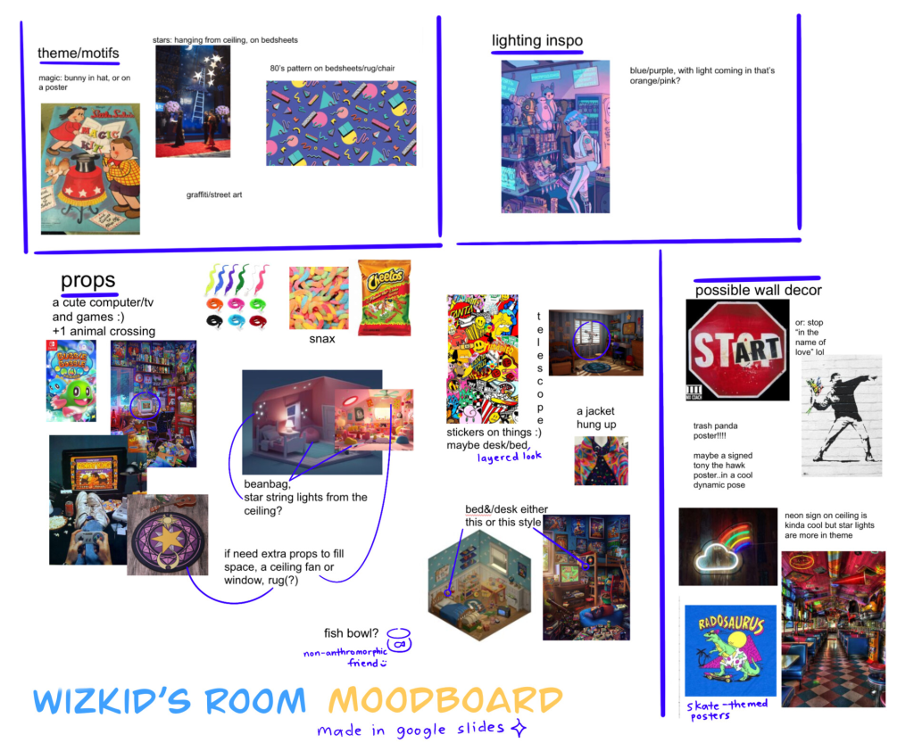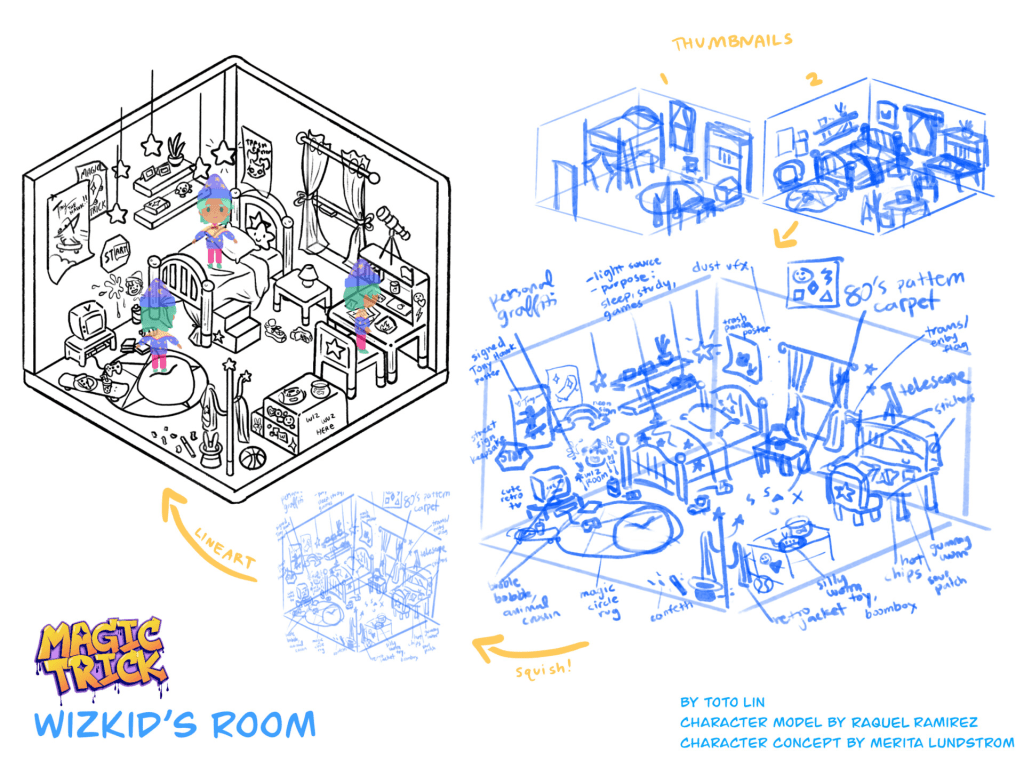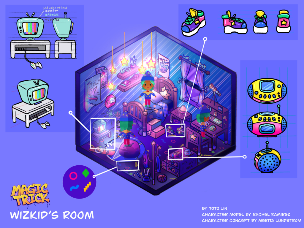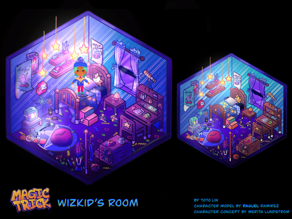 Room concept for WizKid, a wizard kid who can do magical tricks with their skateboard.