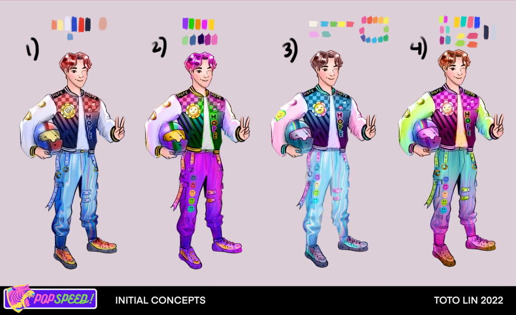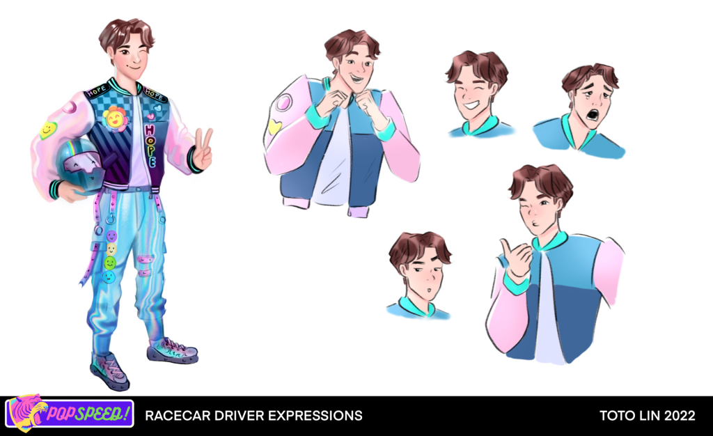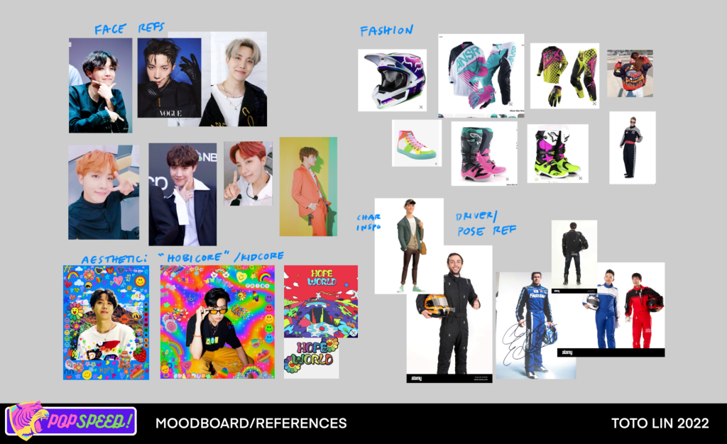 As a personal project, I wanted to design a concept based on celebrity likeness. I’ve been wanting to make a brightly colored racecar driver for a while, and J-Hope’s charisma and fashion sense makes for an upbeat, friendly character design inspired by him. See the accompanying UI mock-up for this game here: https://jellolin.art.blog/portfolio/racing-game-ui-mockup/