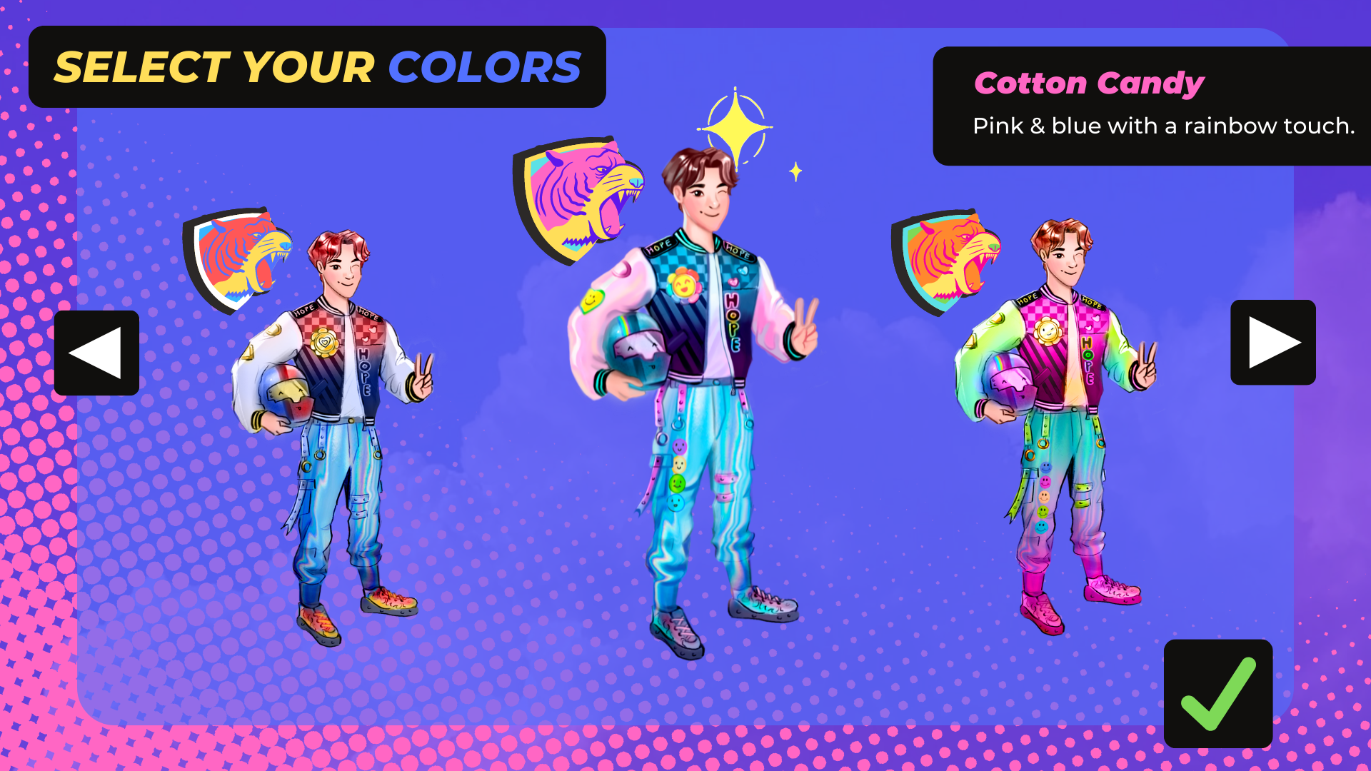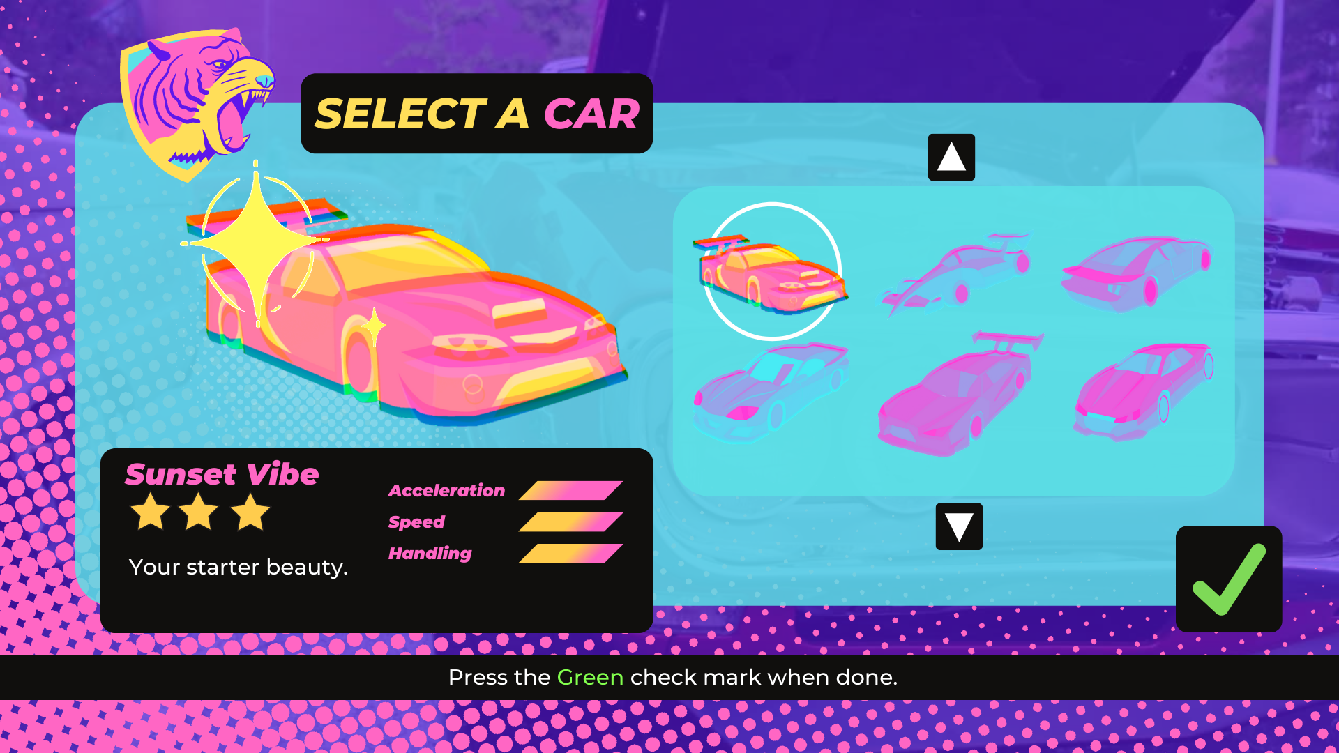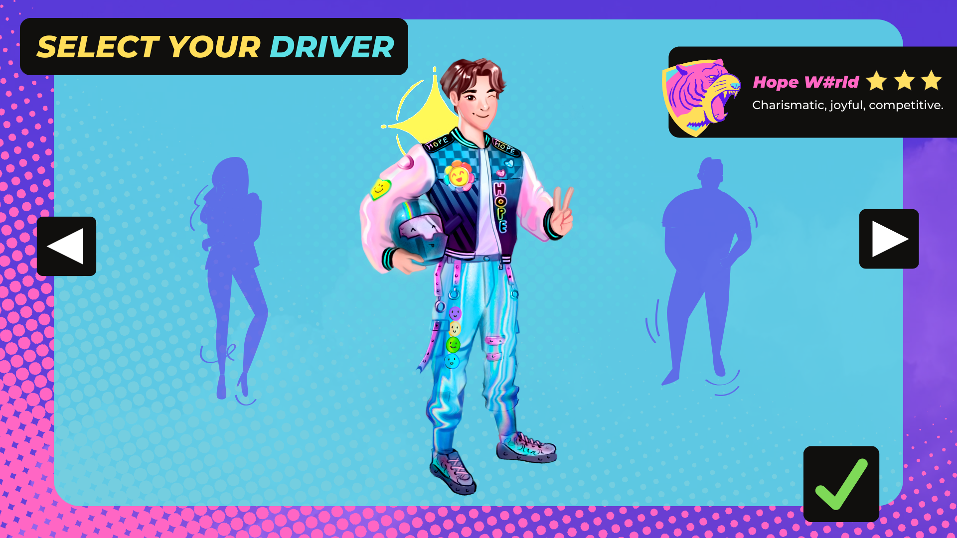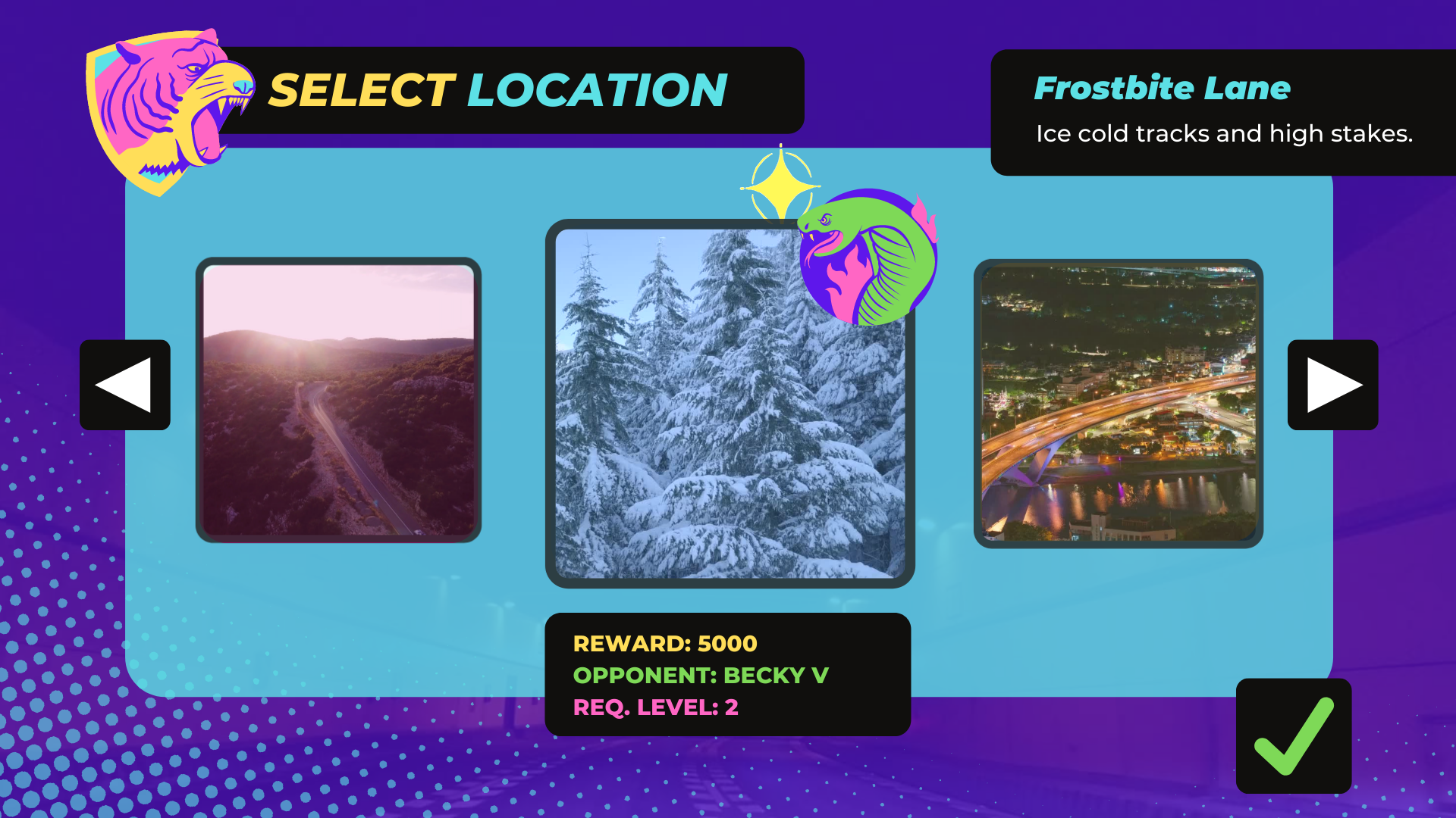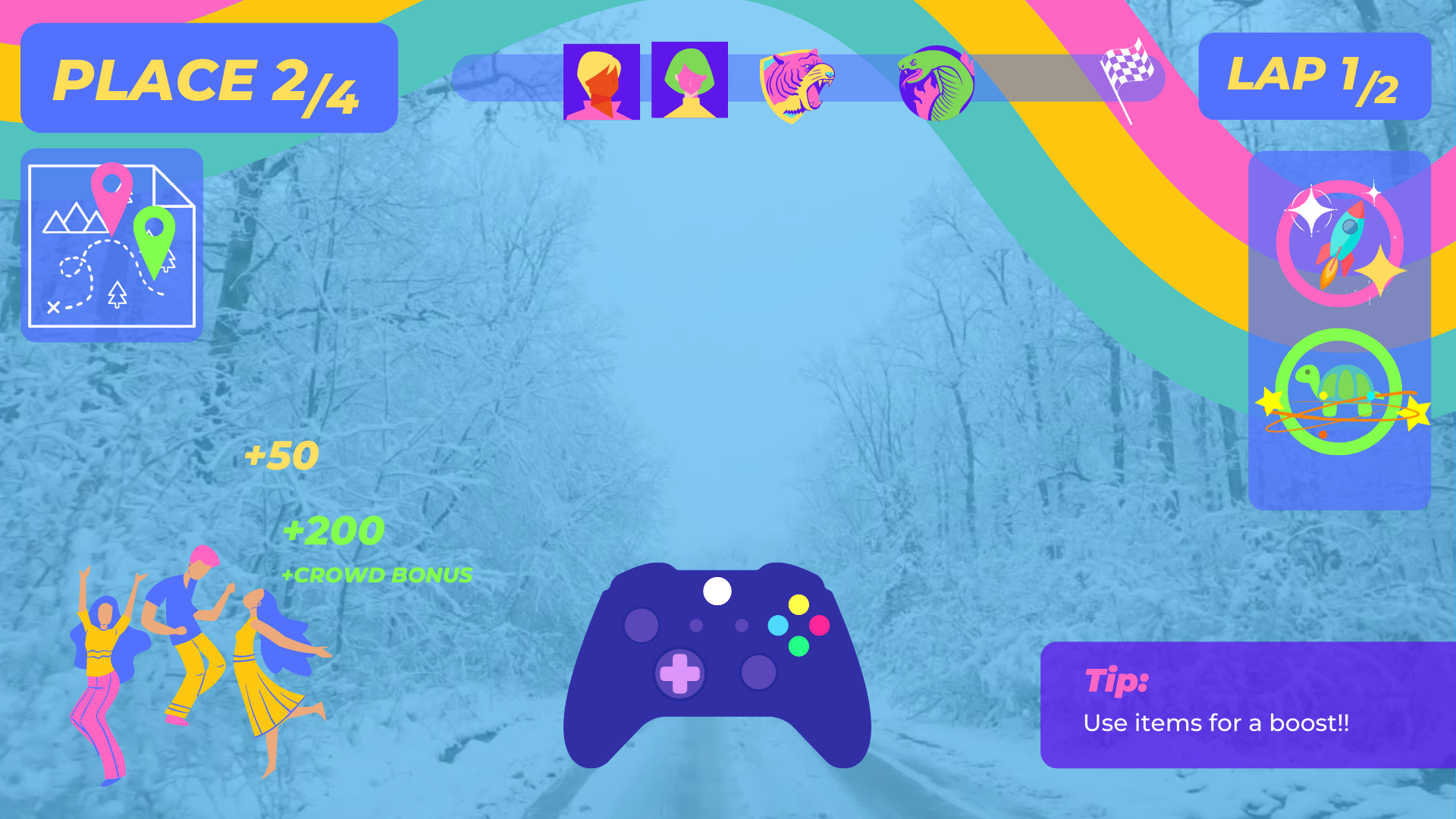 As a personal project, I explored User Interface aesthetics for a racing game concept that emphasizes a vibrant color palette. I made these slides in Canva, selecting, modifying, and arranging available assets and animations that suited each element to create lively screen mock-ups. I painted the concept for the main character art which you can see here:Â https://jellolin.art.blog/portfolio/popspeed-racecar-driver-concept/